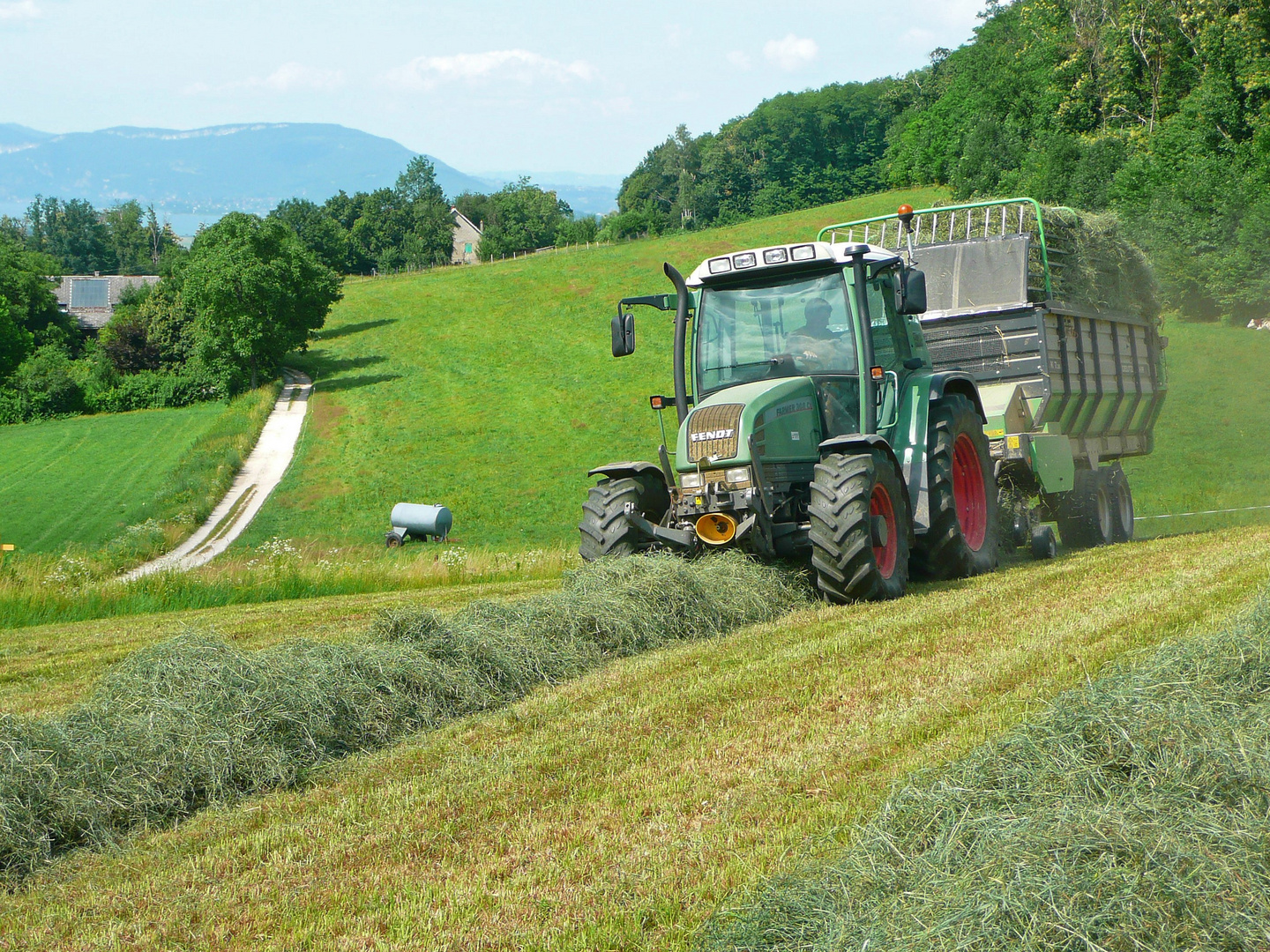 tracteur avec fourche et remorque