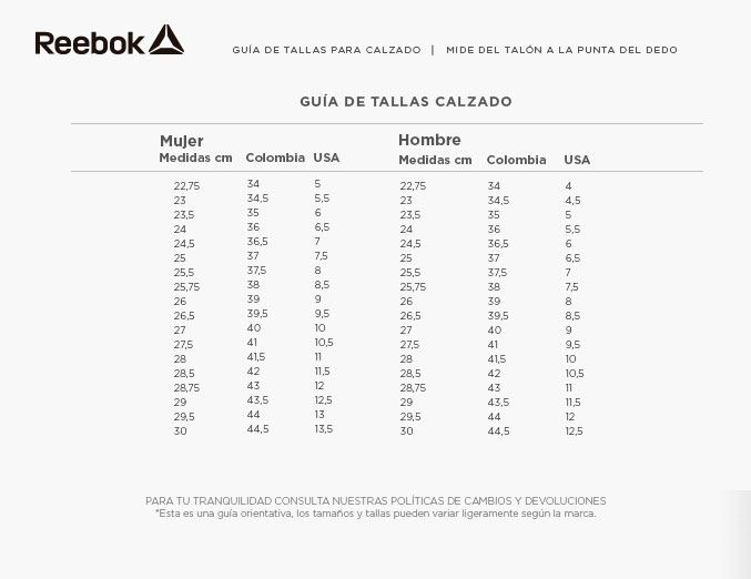 reebok tabla de talles