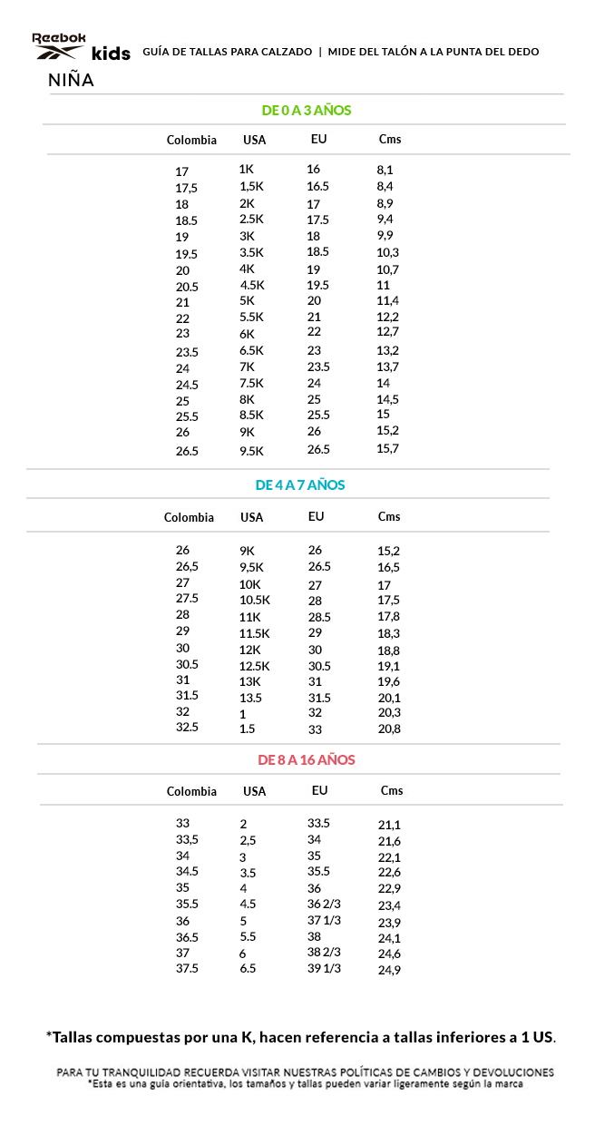 tabla de tallas reebok colombia