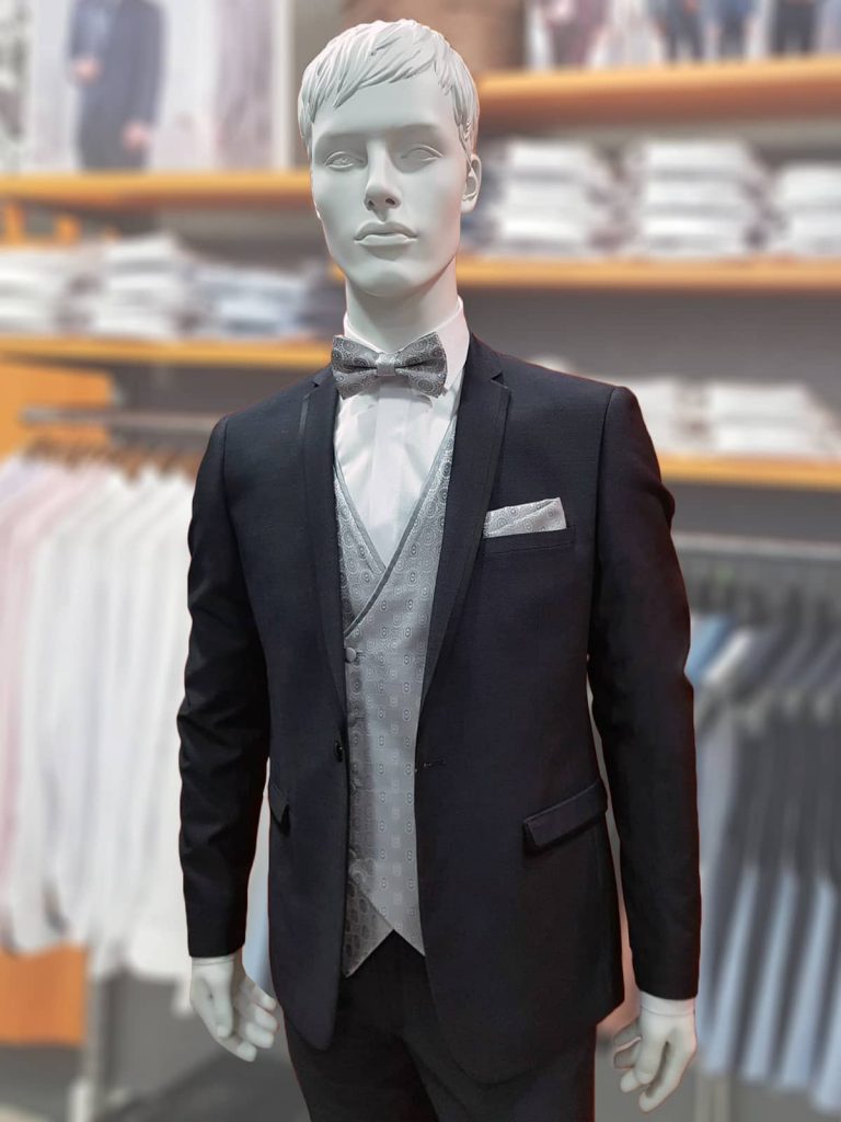traje gris con tenis