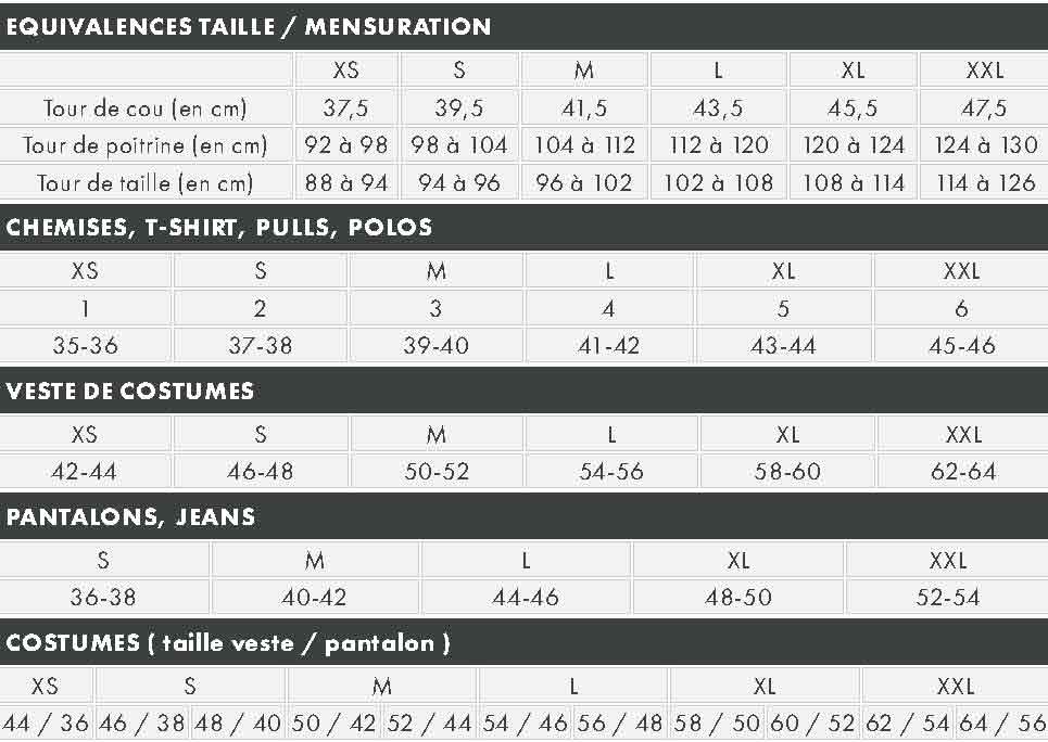 costume taille 52 correspondance