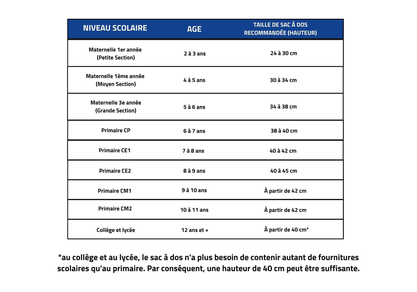 taille sac cp