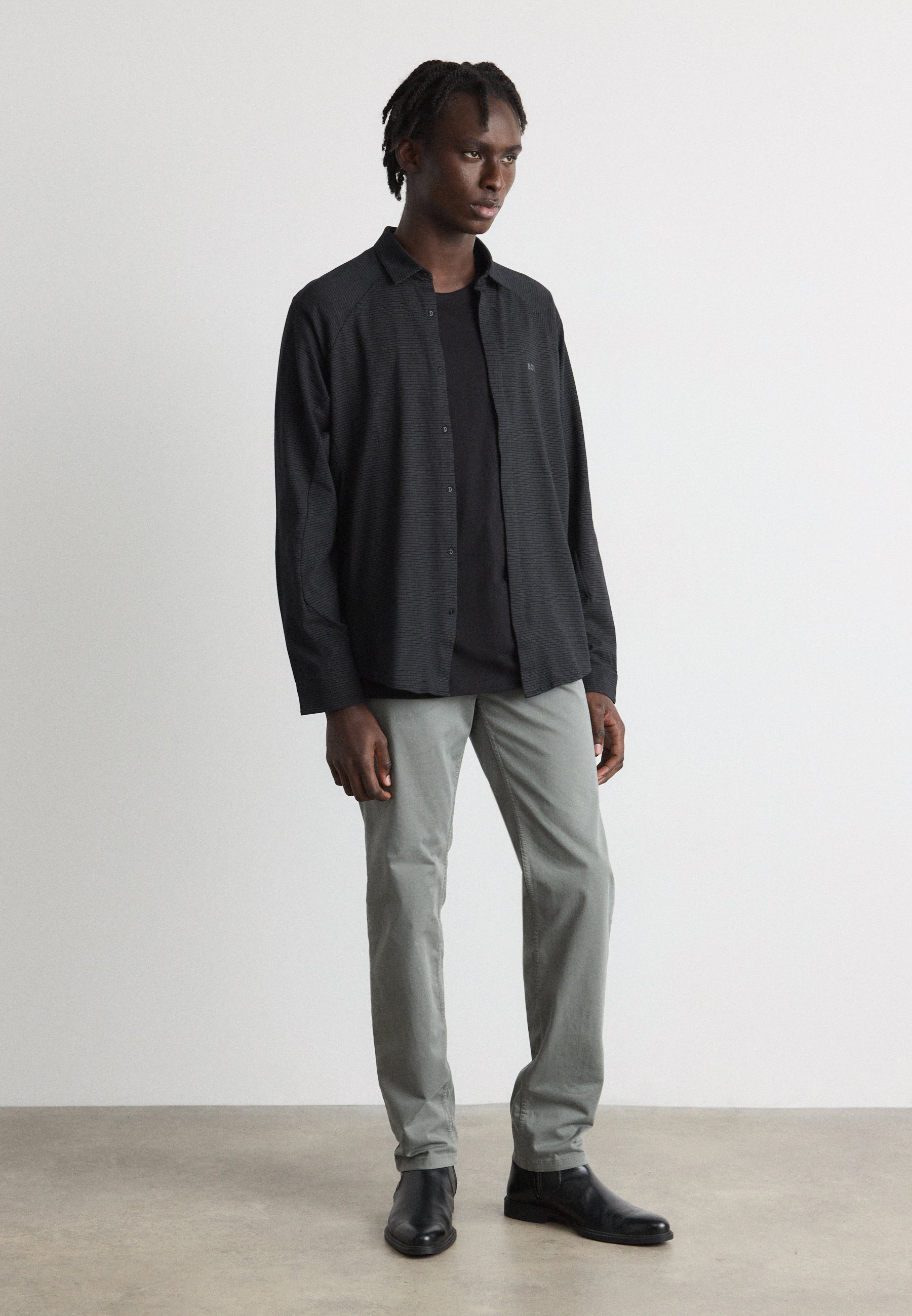 camicia nera e pantaloni grigi