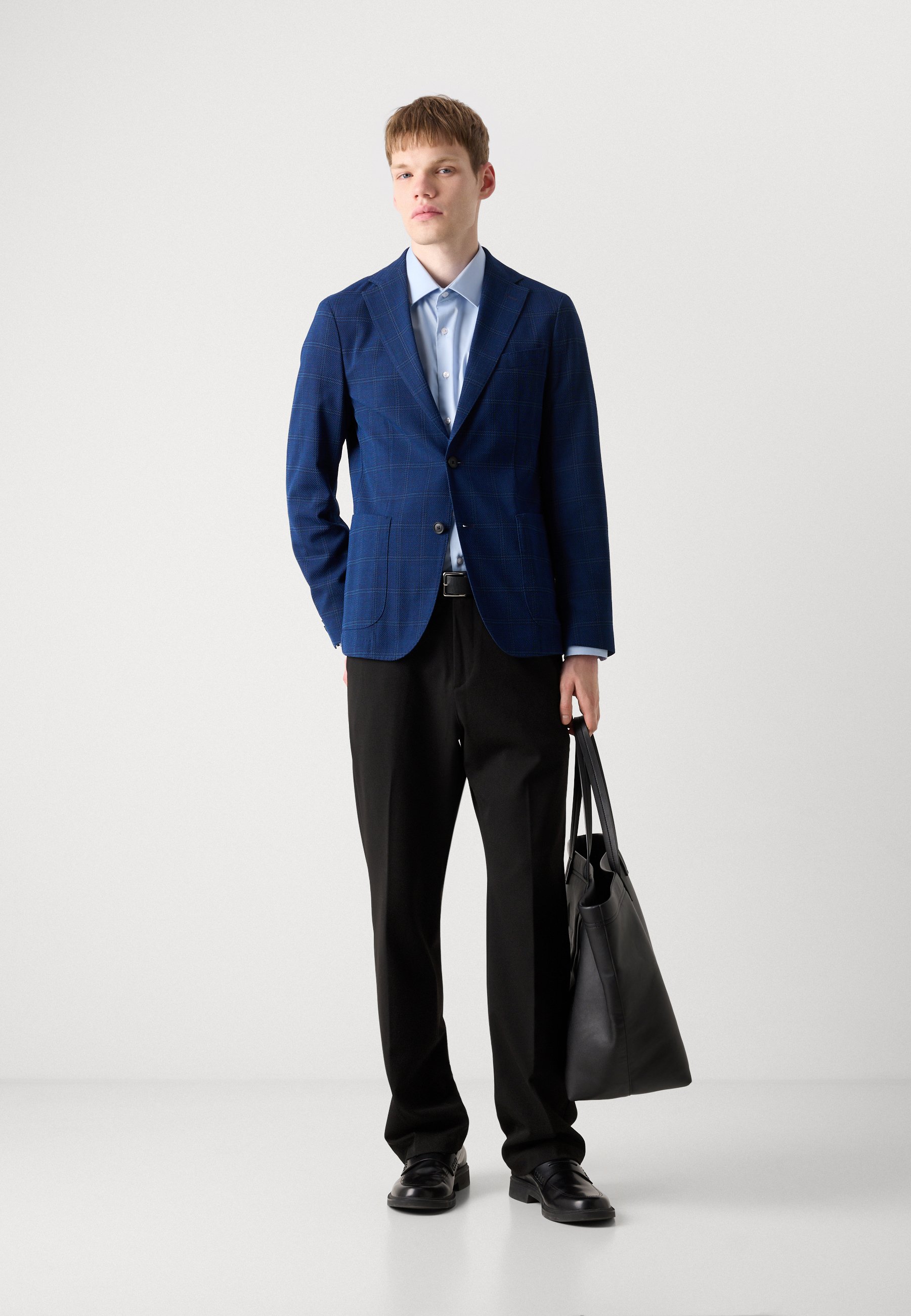 giacca blu con pantaloni neri