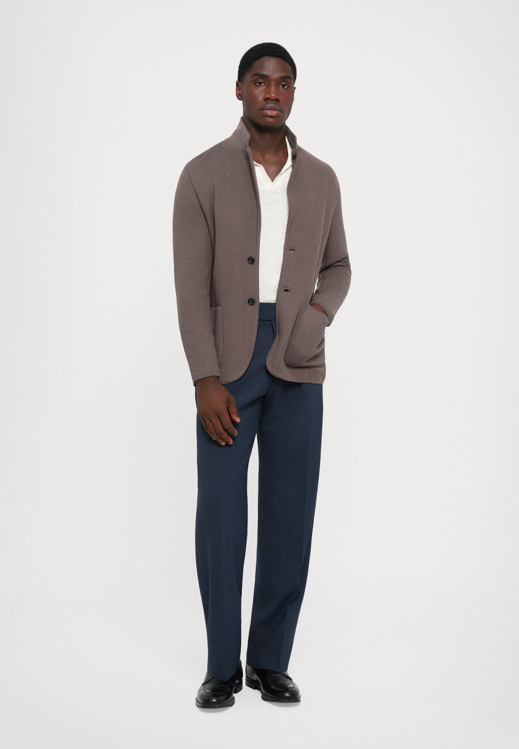 giacca marrone pantaloni blu