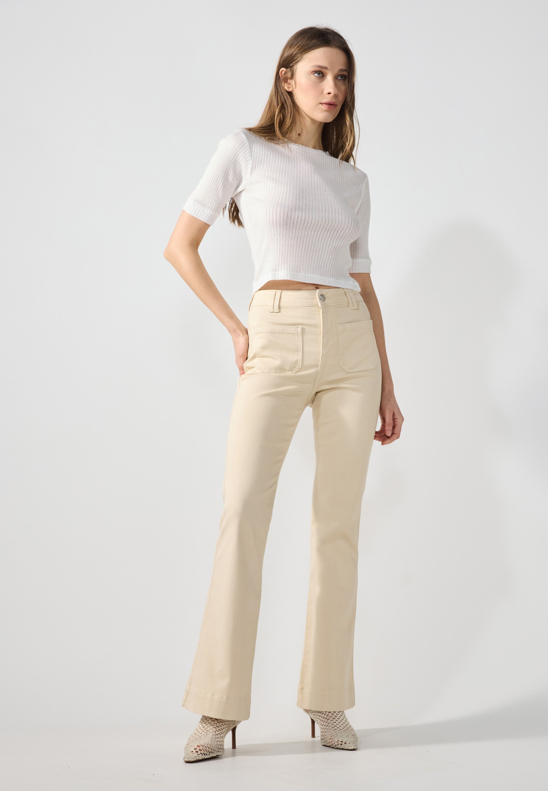 outfit pantaloni a zampa beige