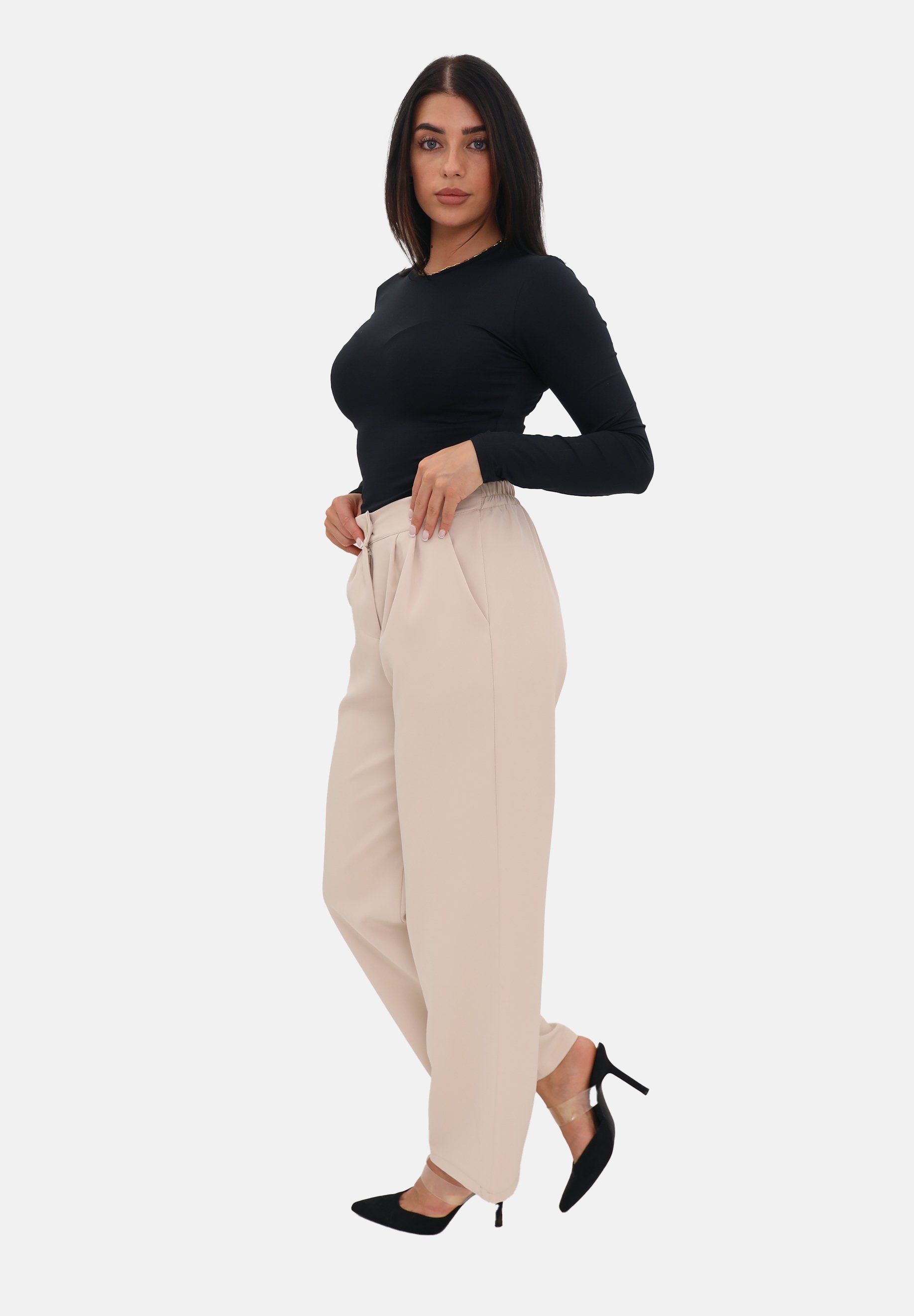 pantaloni beige maglia nera