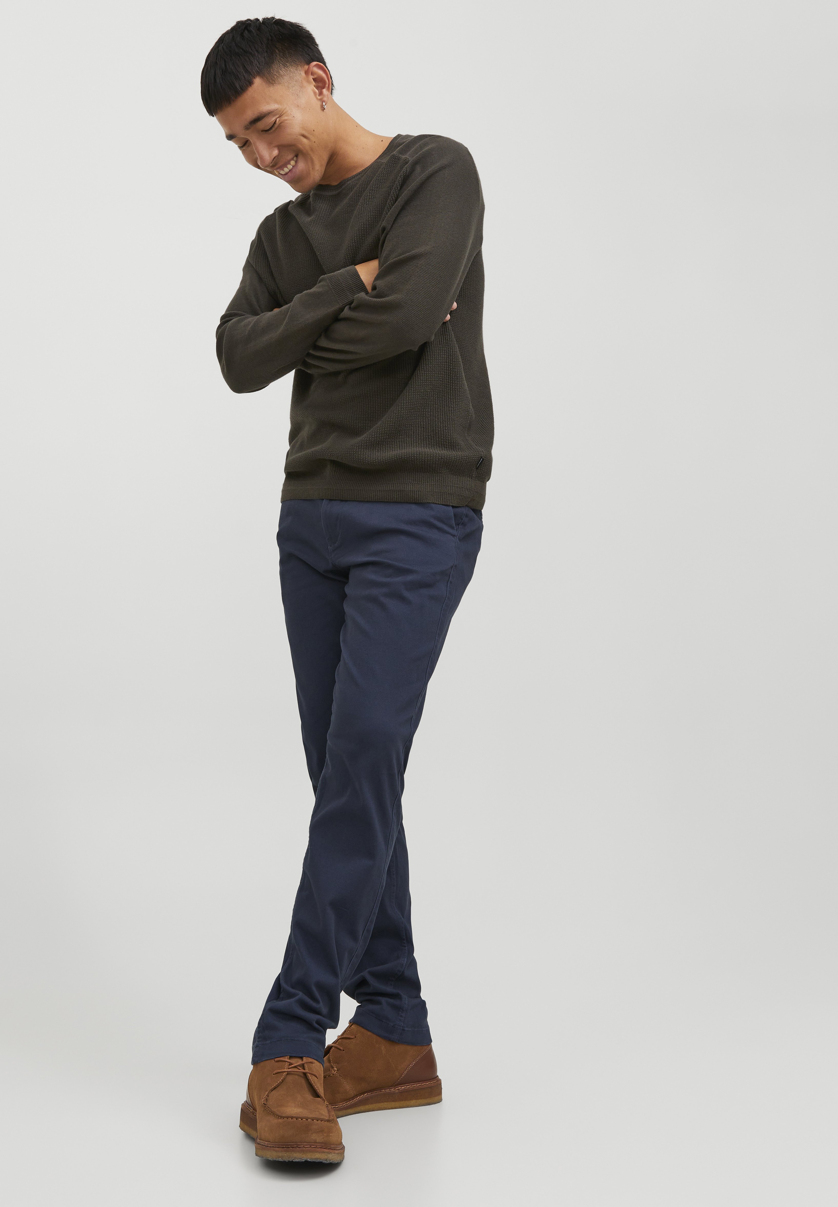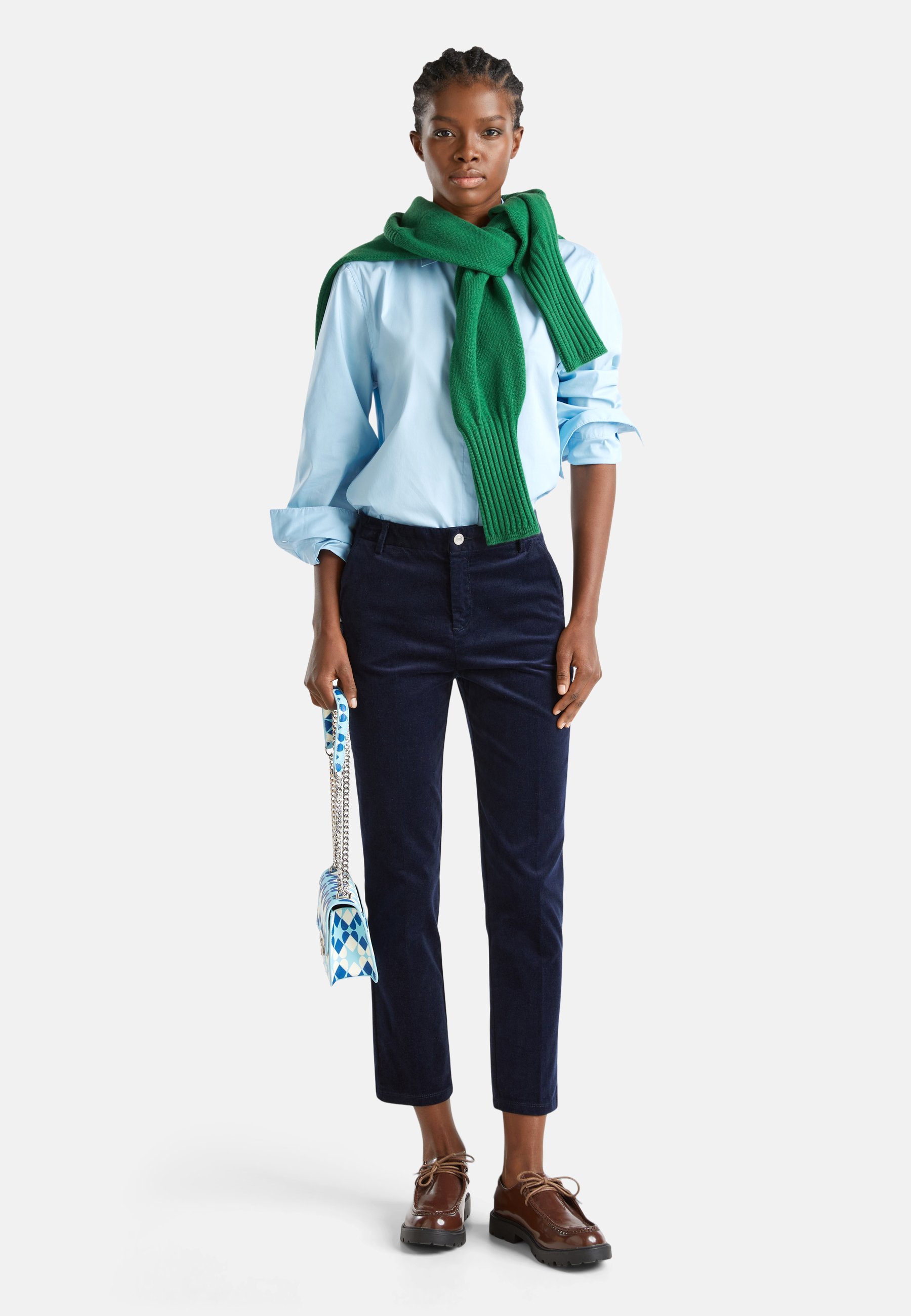 pantaloni blu scarpe marroni