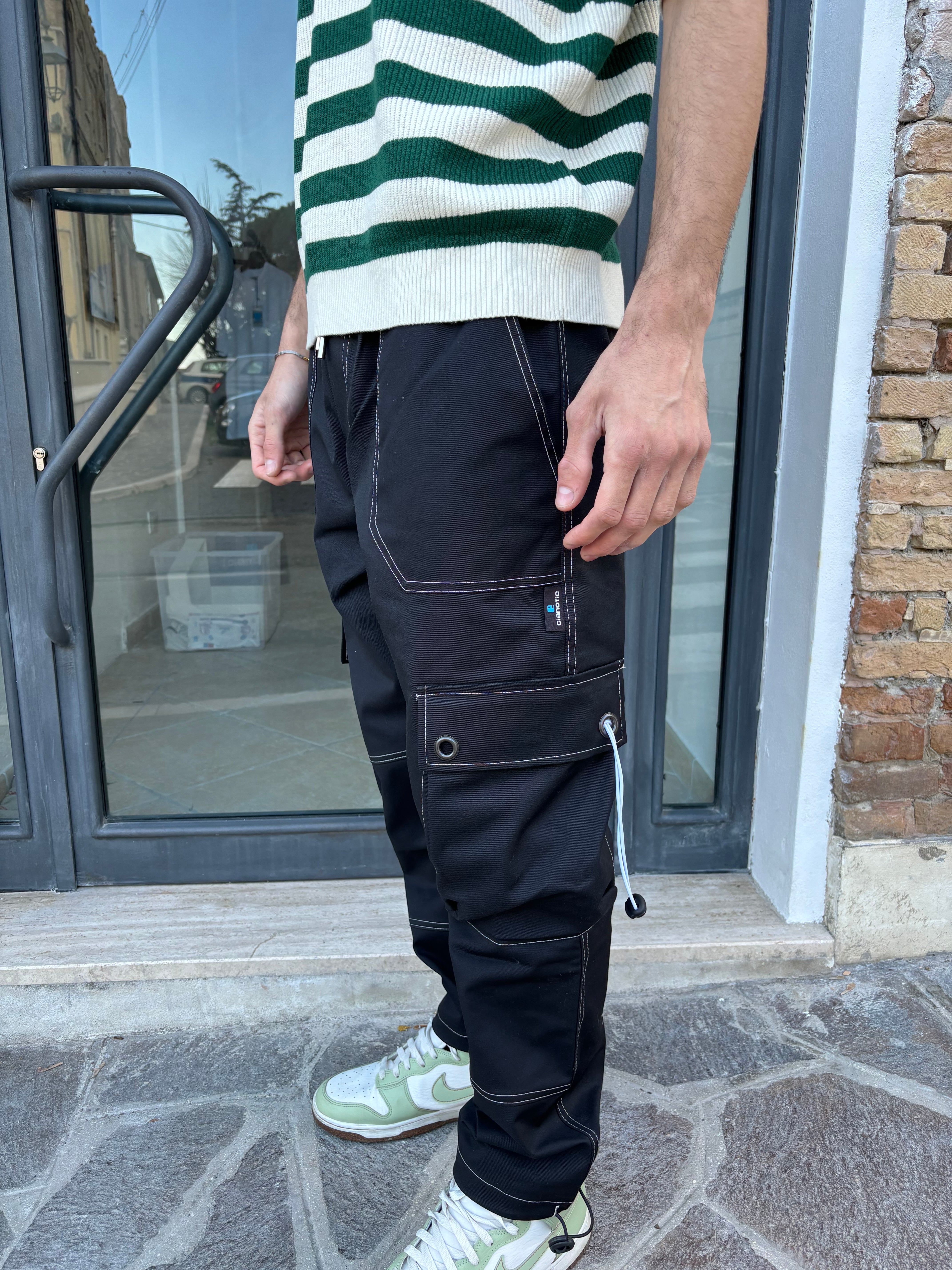 pantaloni cargo con cuciture bianche