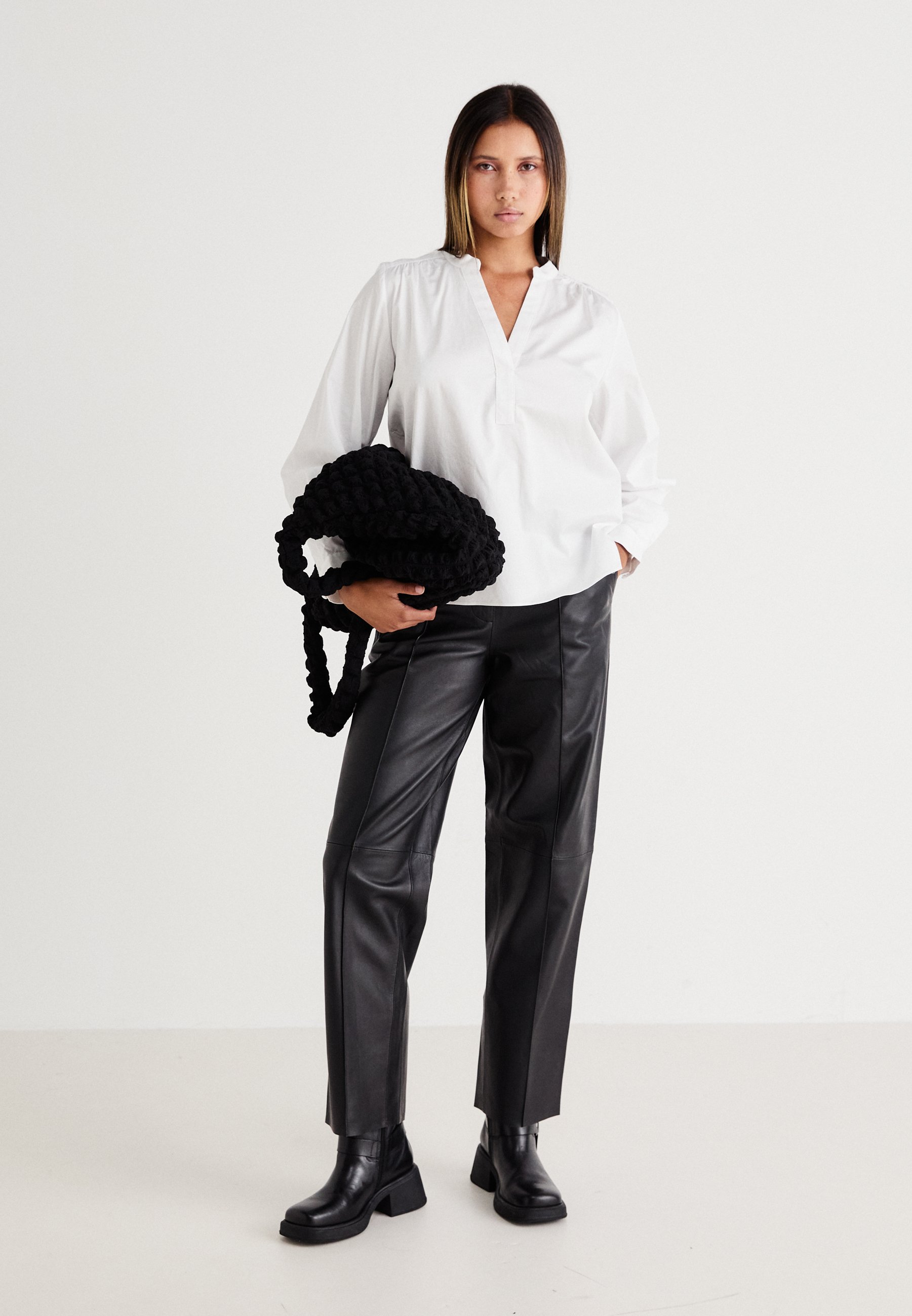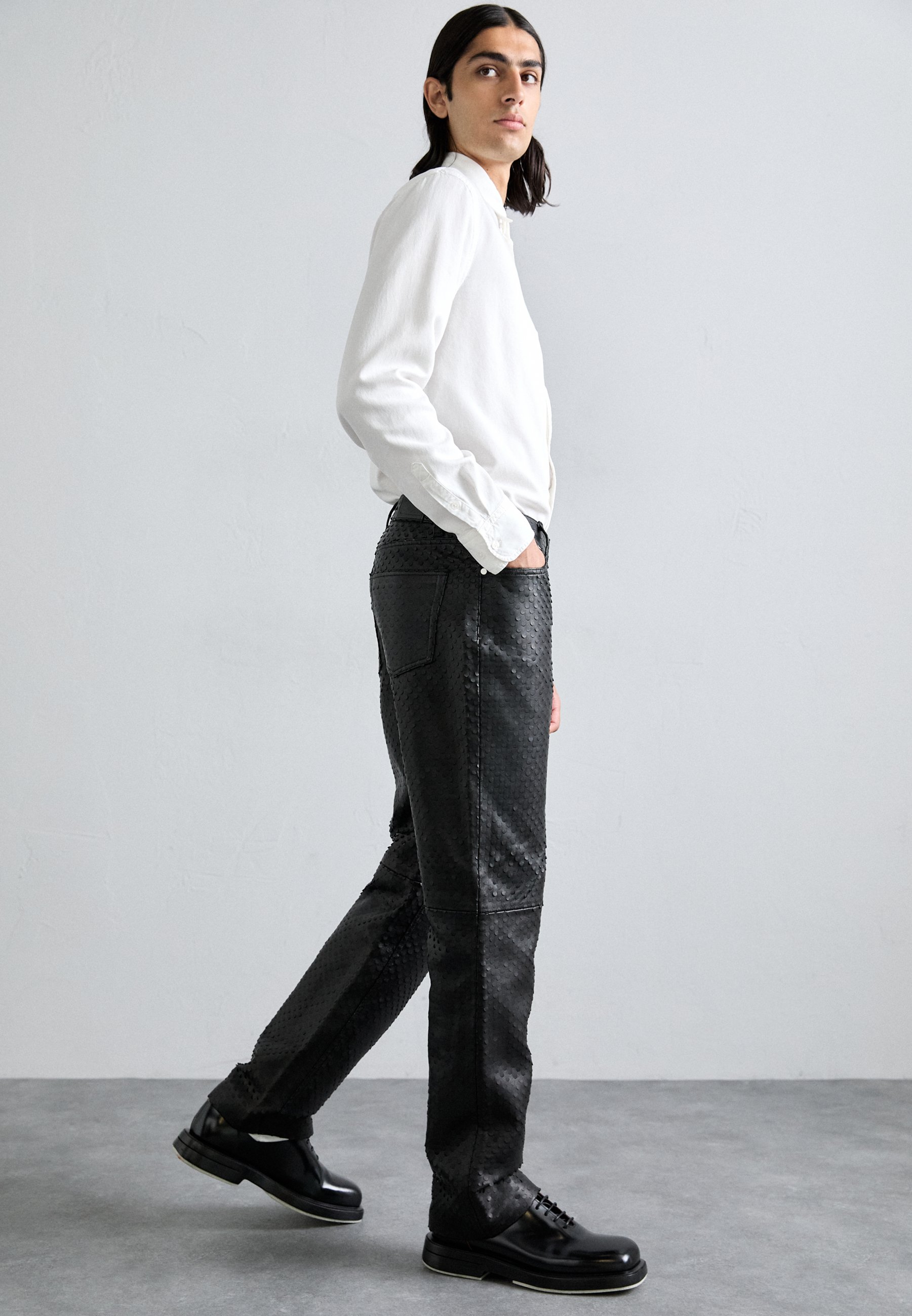 pantaloni di pelle e camicia bianca