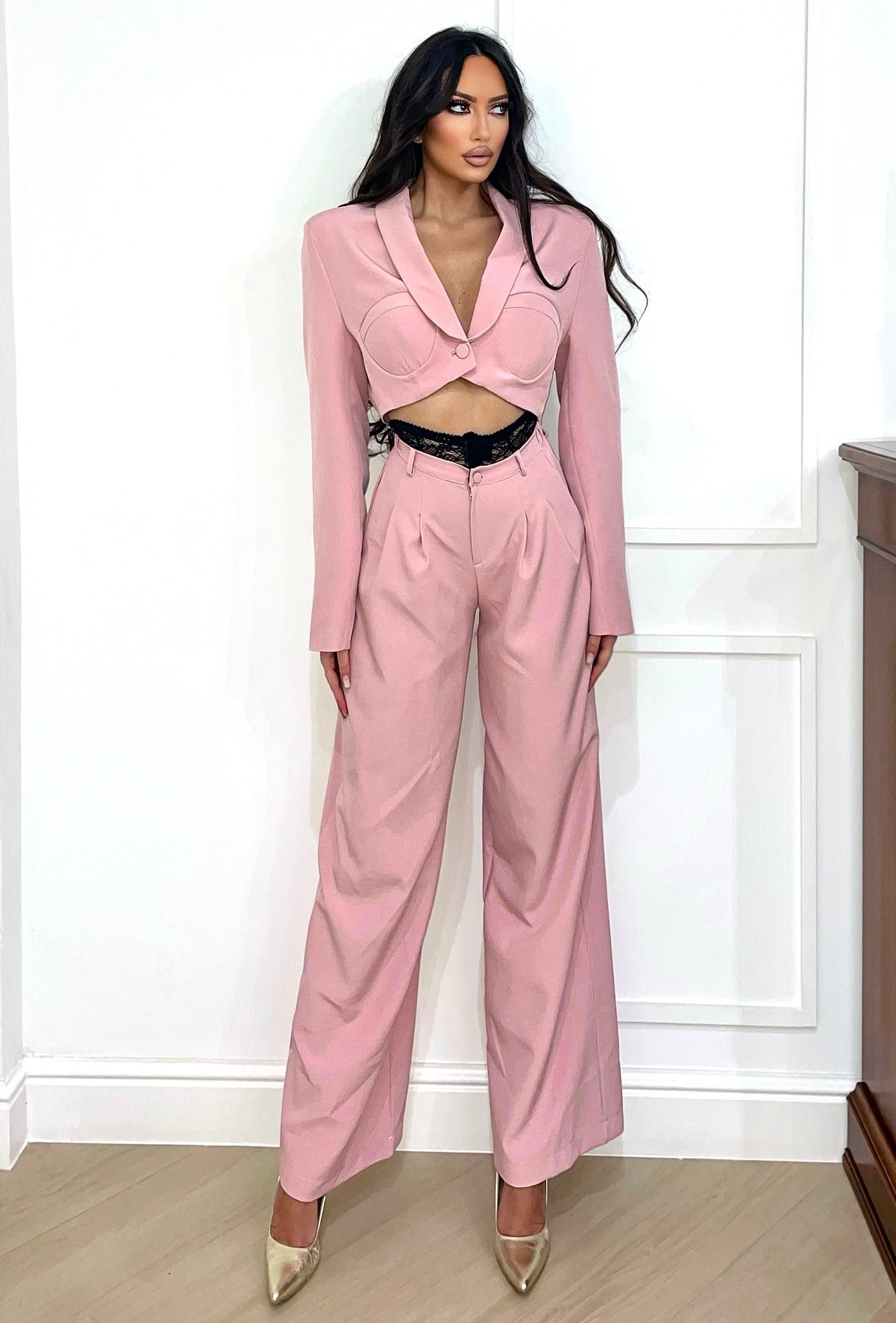 pantaloni neri e giacca rosa
