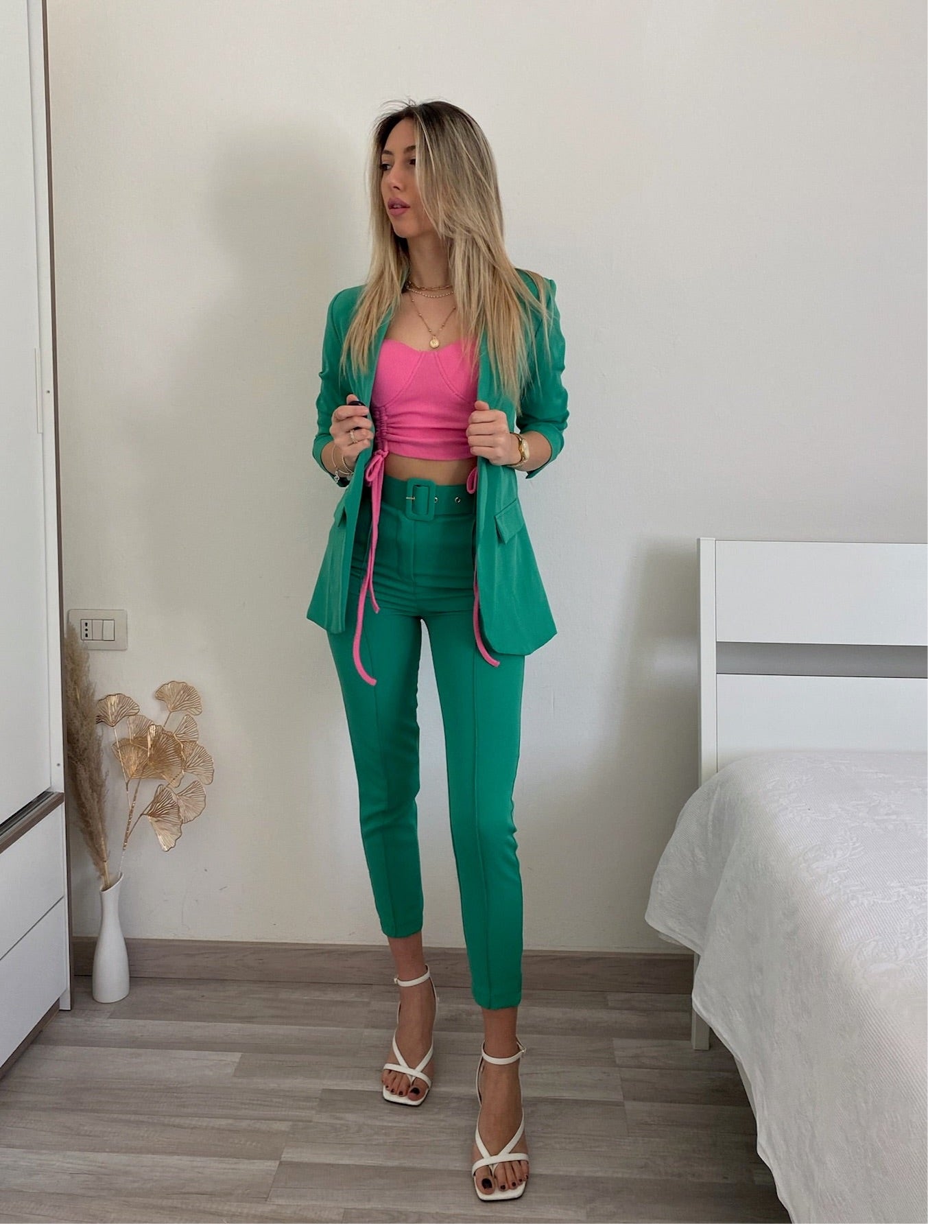 outfit pantaloni verde smeraldo