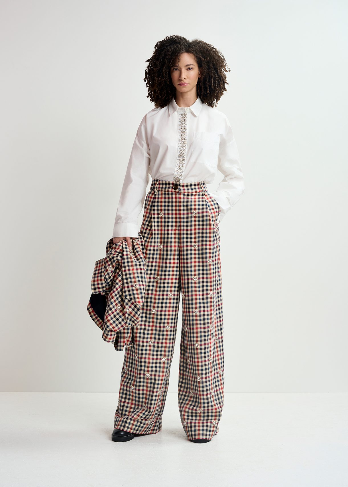 pantaloni a quadri beige