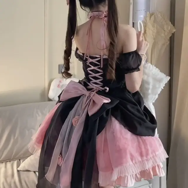 costume rosa con pizzo nero