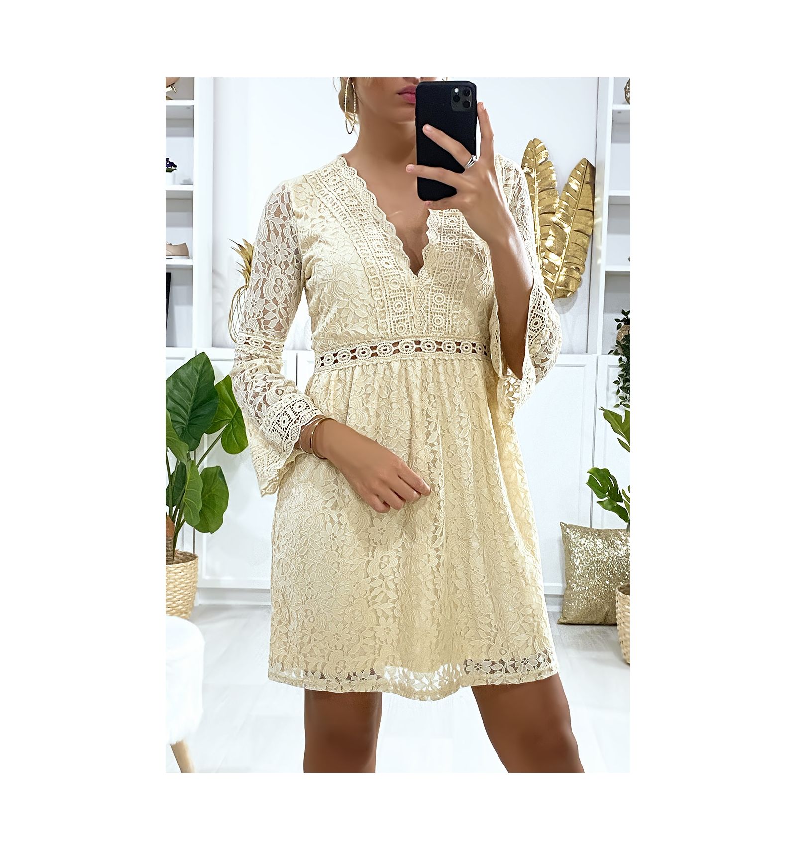 robe beige avec dentelle