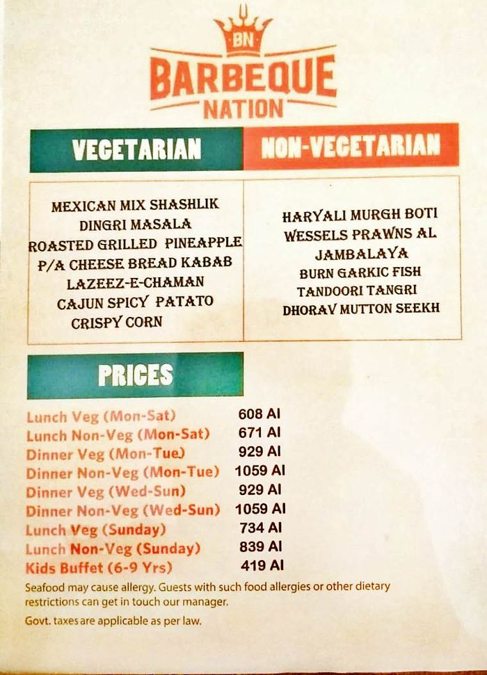 barbeque nation price list