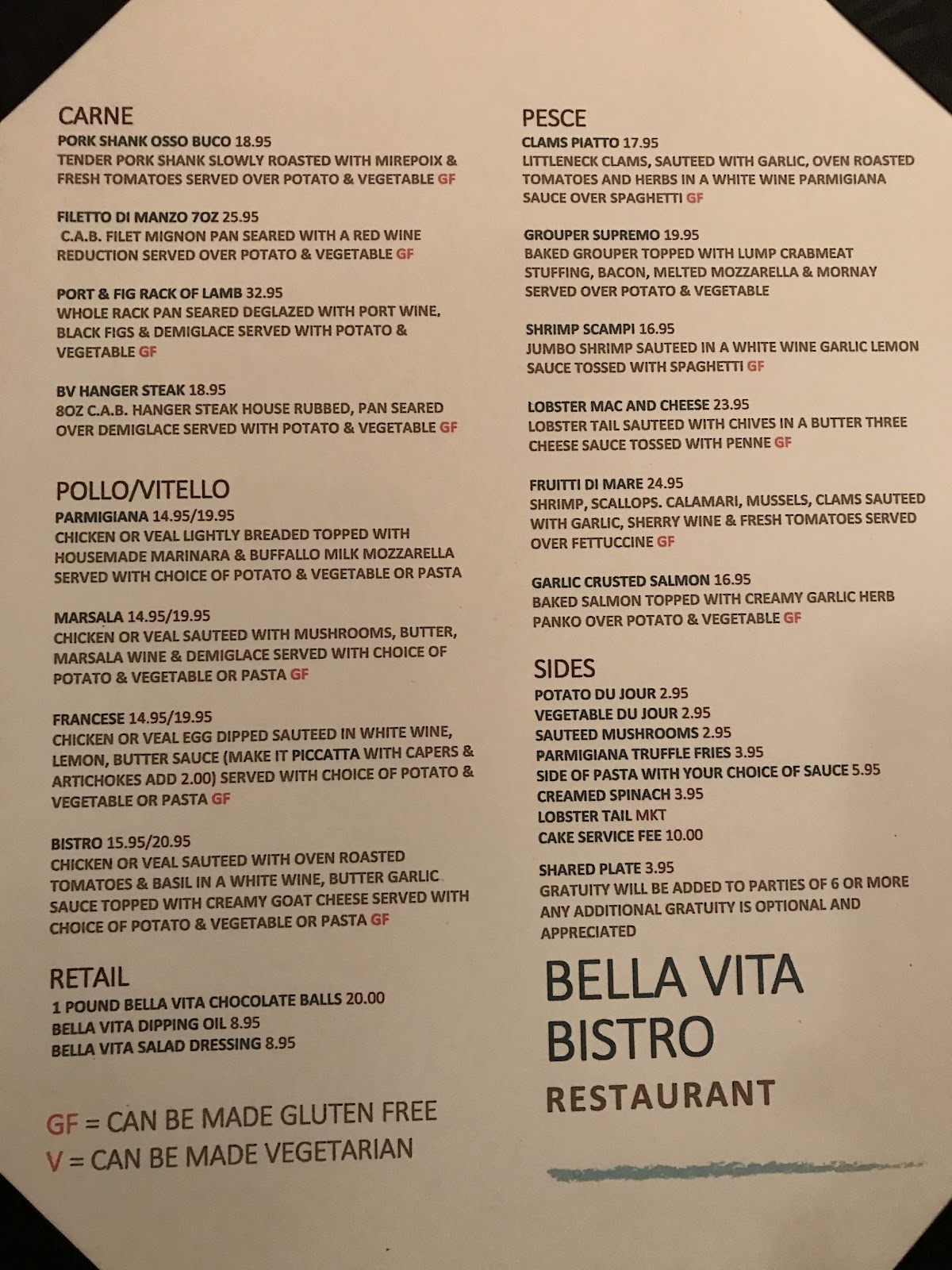 bella vita menu