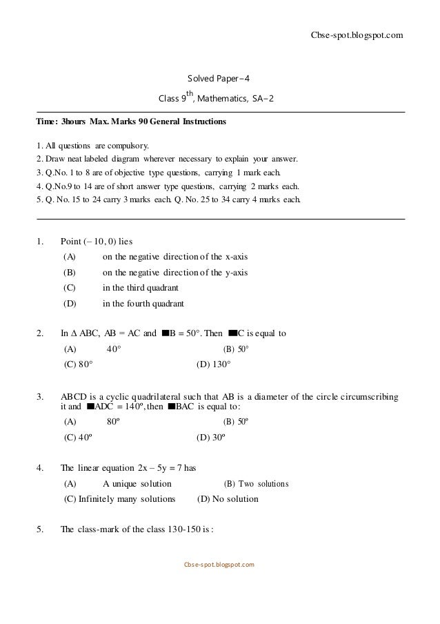 cbse question paper for class 9 maths