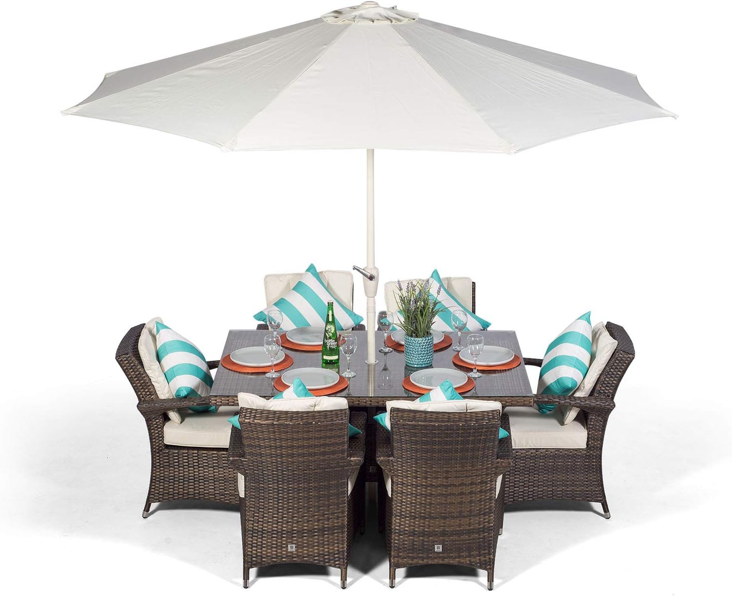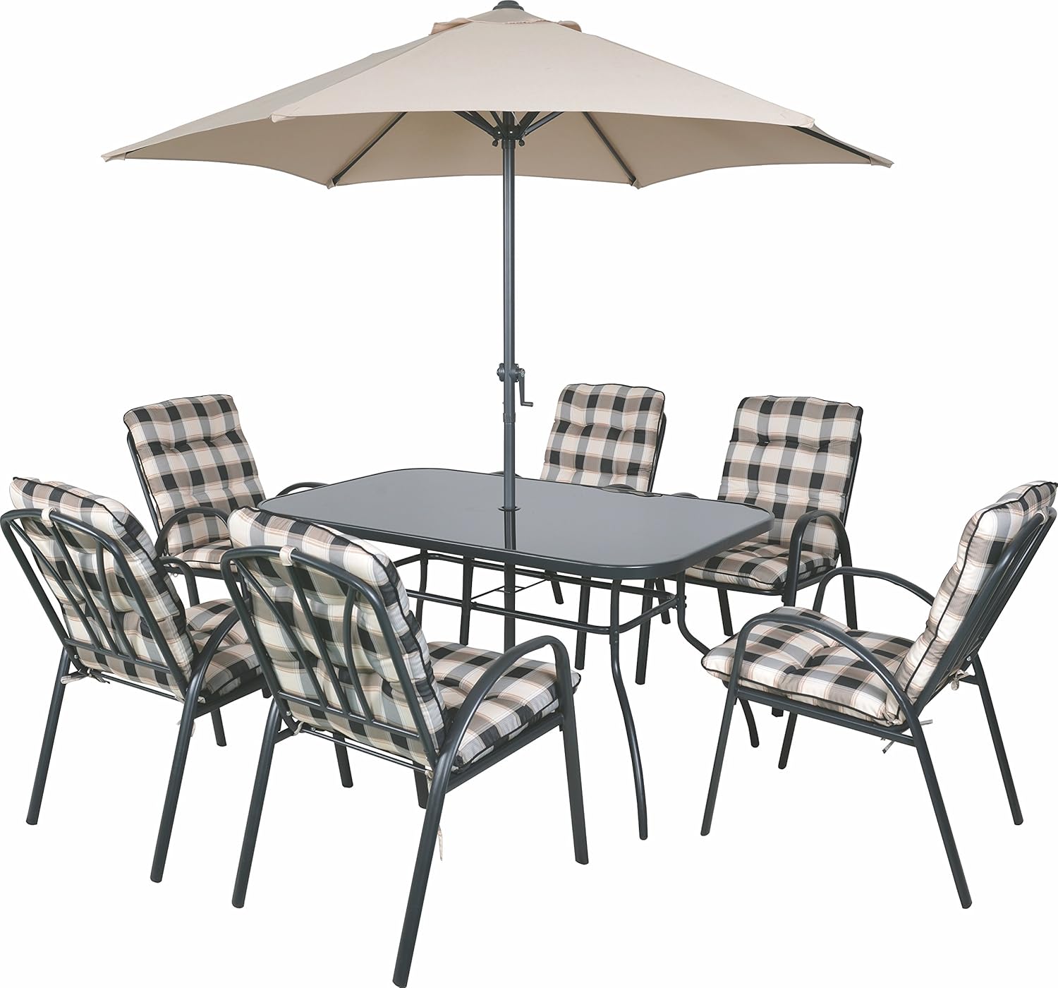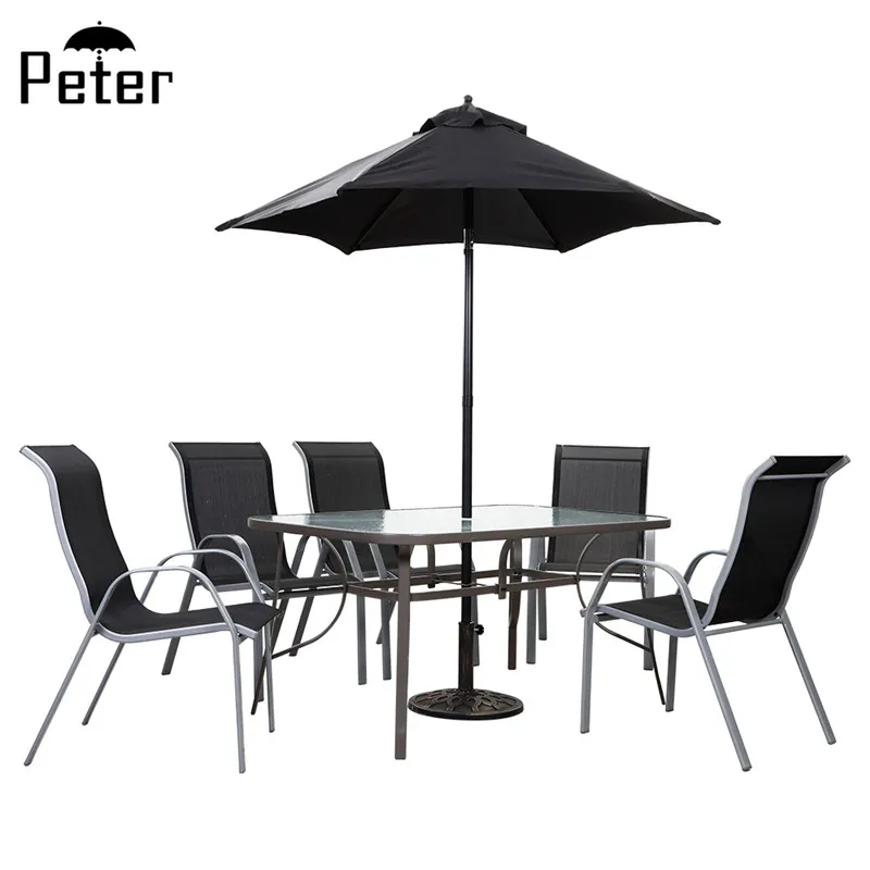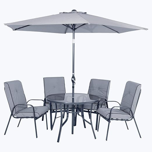 garden table and chair with parasol