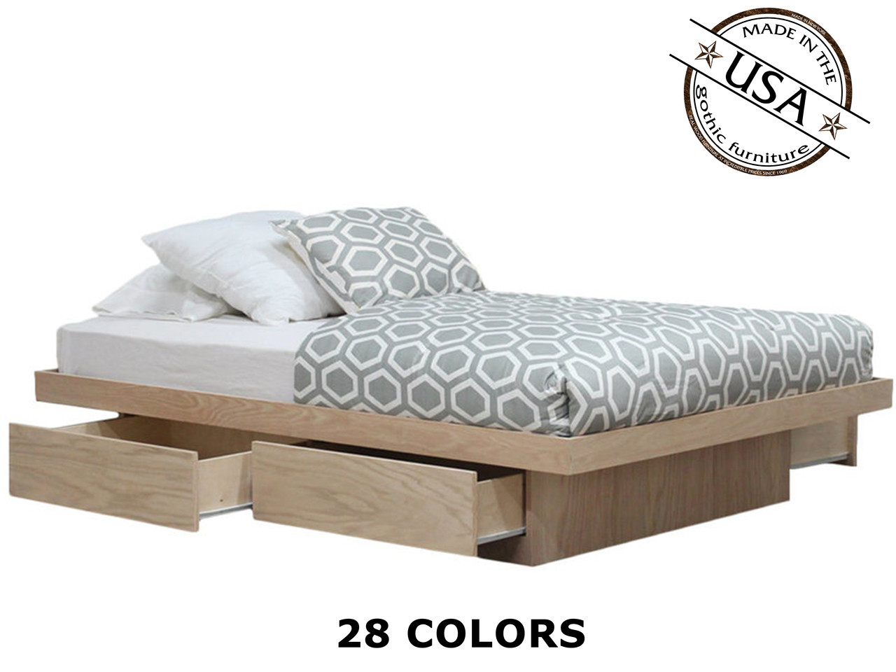white platform bed with storage