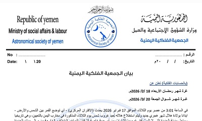 أعلنت الجمعية الفلكية اليمنية، في بيان رسمي صادر عنها، أن يوم الأربعاء